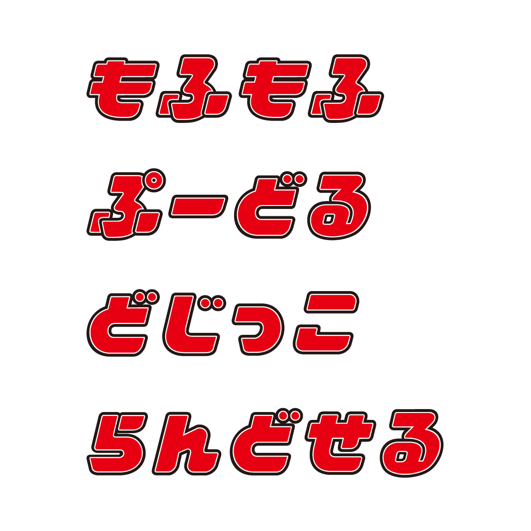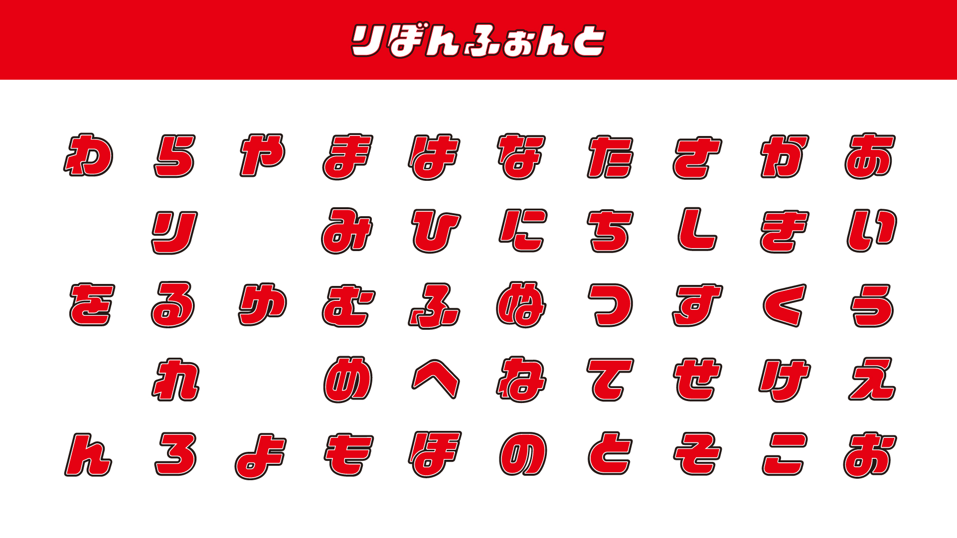 フォントワークスは、「り」「ぼ」「ん」の文字から、五十音のひらがなを作り出す取り組みに参画しました。まず、ロゴをもとに、文字のルールを構築。そして、濁音・半濁音も含めた書体へと展開し、95文字の書体を制作いたしました。
